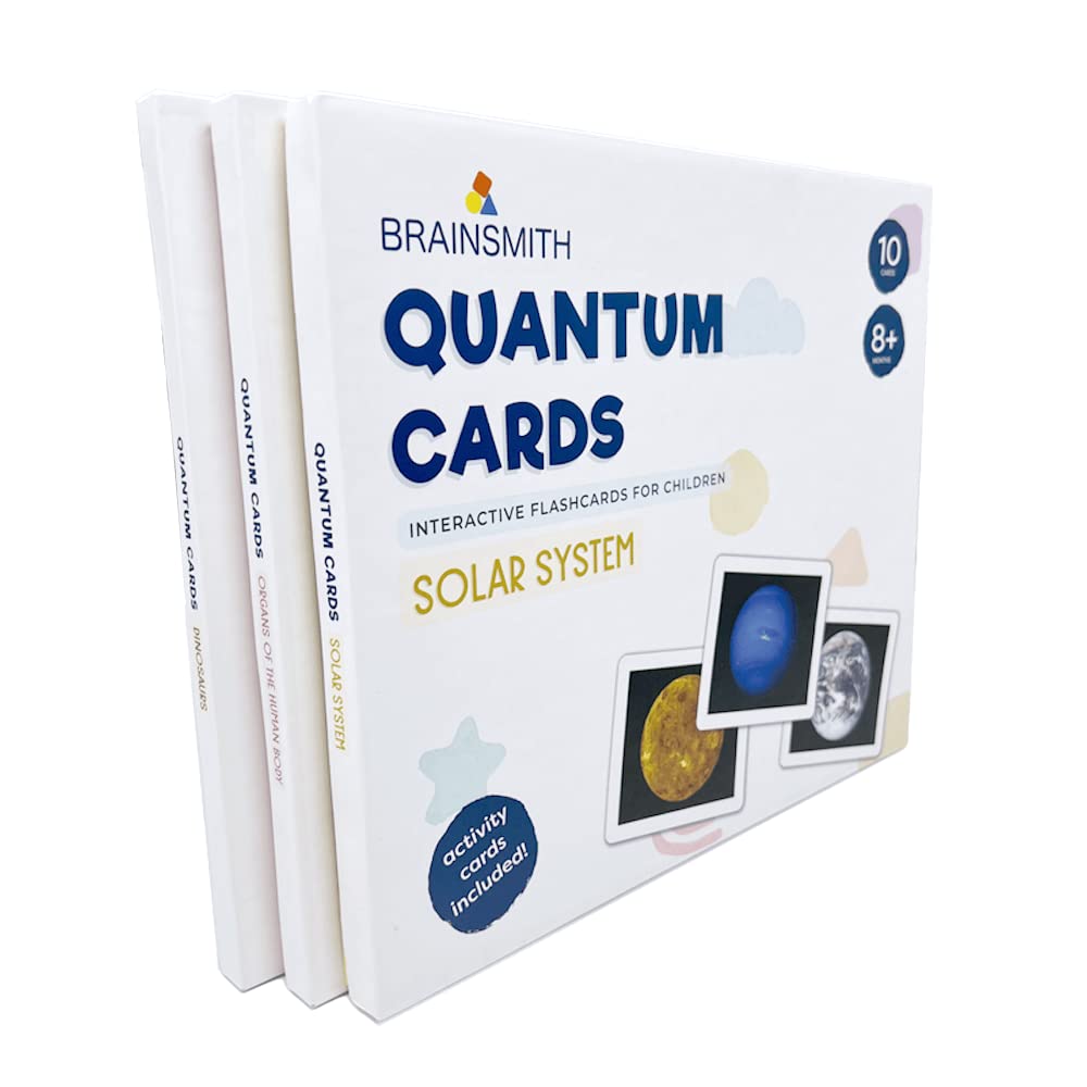 - QUANTUM FLASH CARDS (SET OF 30 CARDS): The educational Quantum Flashcards for toddlers are imperative for auditory and visual stimulation and brain development for babies and kids. This gift set includes 3 sets of 10 cards each - Solar System, Organ Of The Human Body and Dinosaurs. Each card has the image on one side and facts of the on the other side. Each card is thick and laminated for long-lasting use.