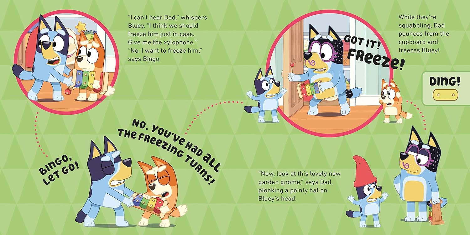 With the help of Bluey and Bingo's magical xylophone, Dad can be frozen in time and space. When you see Bluey and Bingo in the story, hit each of the colored buttons on your Magic Xylophone to help them freeze and unfreeze Dad. A sound button with Bluey and Bingo laughing is also included!