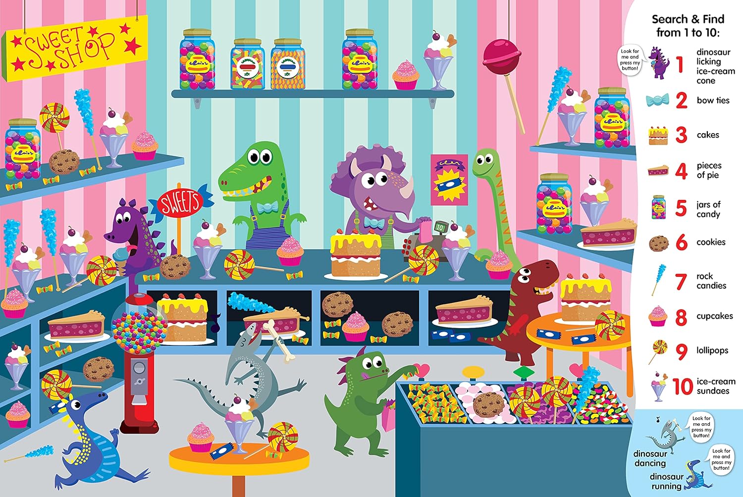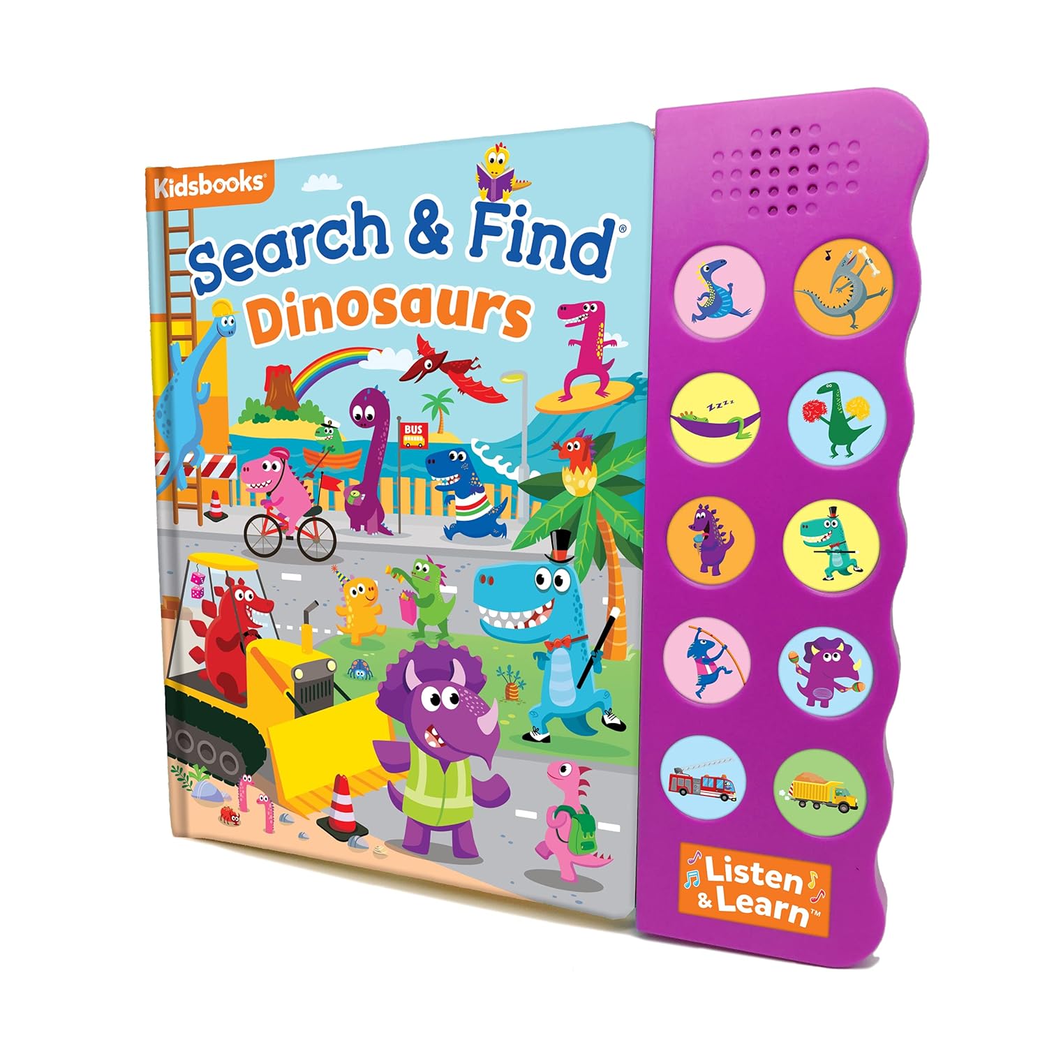 Youngsters will have hours of fun while they look for amiable dinosaurs and learn to recognize colors, numbers, and rhymes. Little ones will also enjoy listening to the sounds made by the fascinating characters on each page. This Search and Find series uses ten entertaining buttons to help you recognize words, pictures, numbers, and sounds! Ten entertaining buttons help users recognize words, pictures, numbers, and sounds in this Search and Find series! "-" On each page, children will search for distinctive objects and characters, then touch the buttons to hear the sounds they produce. "-" Preschoolers are introduced to common vocabulary as they embark on a learning journey via well-known locales in these stories.