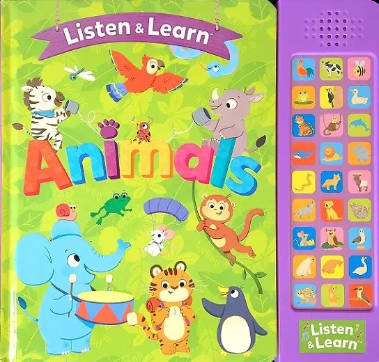 To hear the names of the animals and their noises, press the 27 sound buttons! Each spread has animals grouped by habitat. Cute pictures to help with word recognition.
