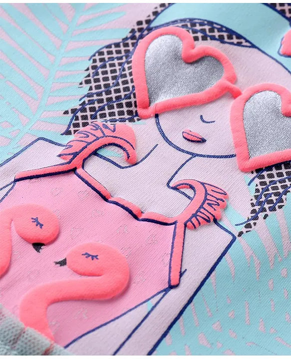 ToffyHouse 100% Cotton Knit Half Sleeves Top & Denim Skirt Set With Doll Print - Pink