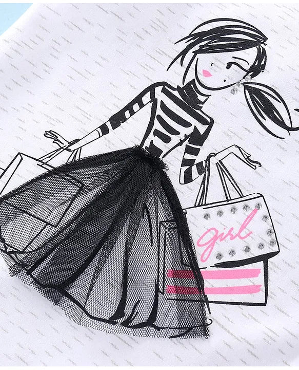 ToffyHouse 100% Knitted Cotton Half Sleeves Top & Woven Mesh Fabric Skirt Set With Fashionista Doll Print - White & Black