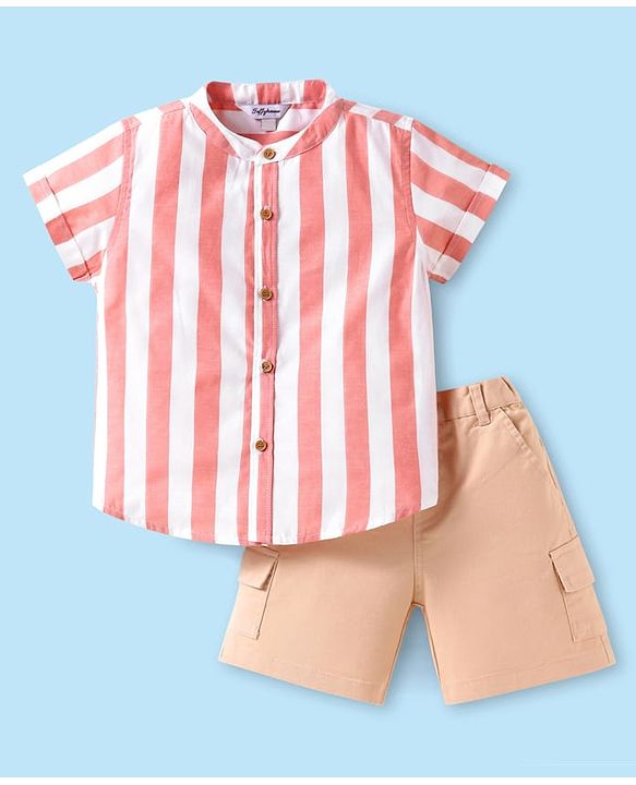 ToffyHouse Half Sleeves Mandarin Collar Striped Shirt & Shorts Set - Red