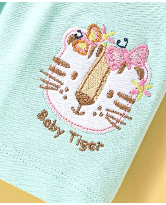 ToffyHouse Interlock Knit Half Puffed Sleeves Frock with Floral Print & Cub Embroidery - Sea Green