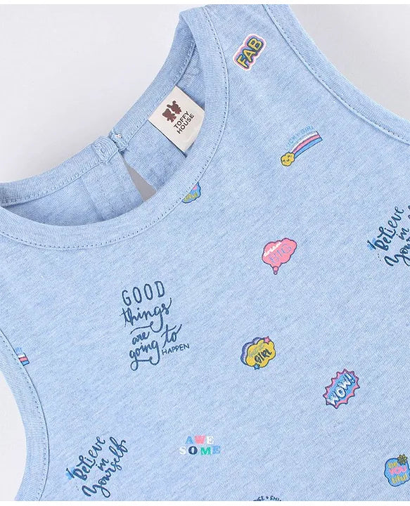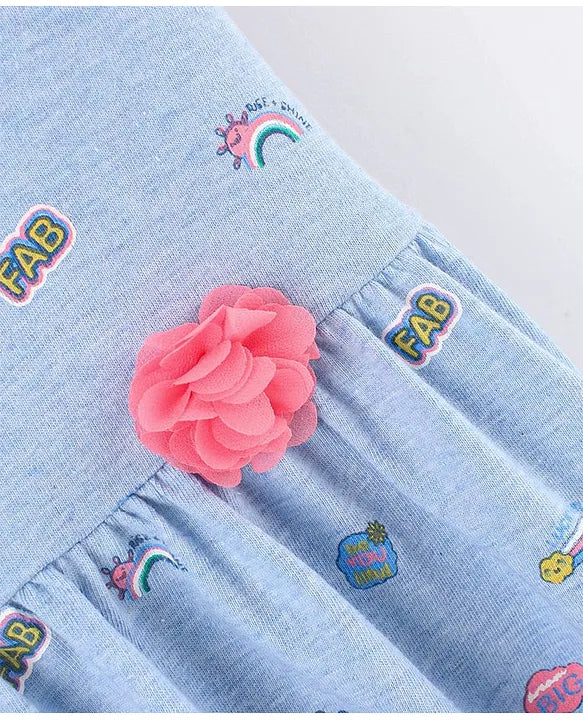 ToffyHouse Toffyhouse Single Jersey Sleeveless Frock With Text Print & Floral Corsage - Blue